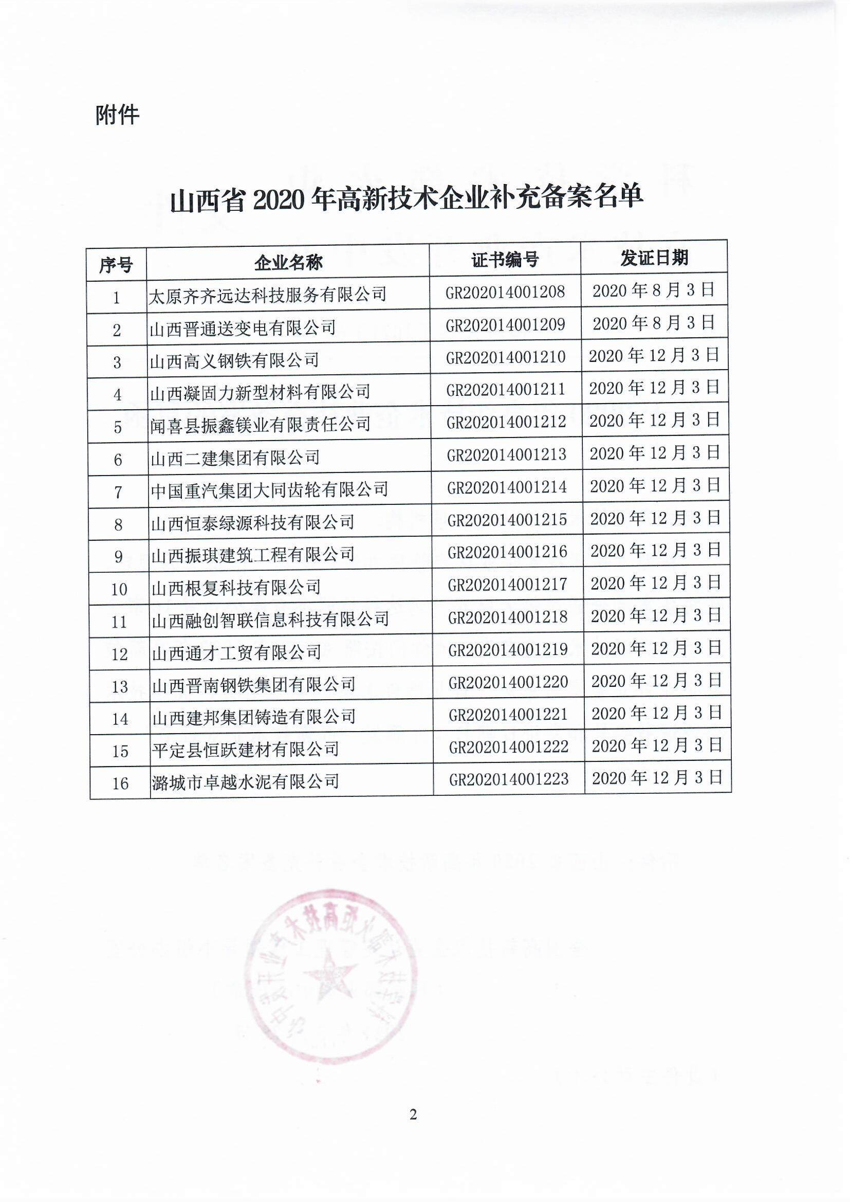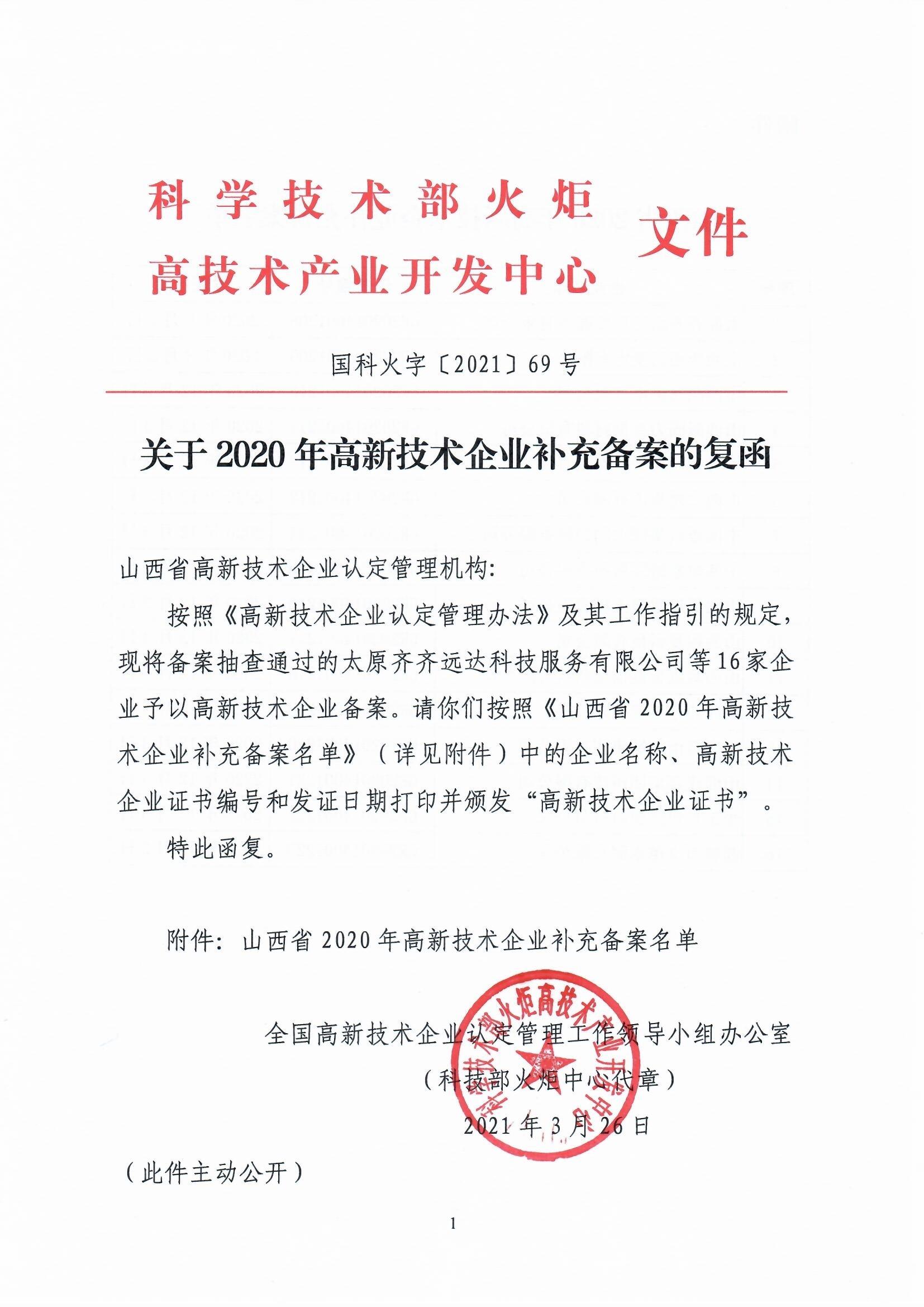 山西關于2020年高新技術企業(yè)補充備案的復函